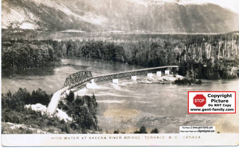 Share via Share via... Twitter Facebook Pinterest × Table of Contents Skeena River Archive Postcards of the Skeena River, Mountain Scenes Ext Links- Skeena River British Columbia, Canada The 2nd longest river in BC, after the Fraser Fiver. First “White” explorer here was a Mr. Whidbey of Captain Vancouver's staff, in July 1793. He only went as far as the Ecstall River. First Nations name for this river was K'shian, alt- Kshi-en, native meaning “Water of the Clouds, per “Skeena river of destiny, by R. Geddes Large (link elow) Skeena River Photos From Lookout off Highway 16, a short distance West of Terrace Views of Skeena River all taken 2005 by myself Please Check out some Terrace Pictures below New Bridge in Terrace from Thornhill to Ferry island Dudley Little “New Skeena” Bridge opened ca 1975 Actually 2 bridges built, photo above first part described below One from Thornhill 4 way stop, on Yellowhead Highway 16, to Ferry Island Other from Ferry Island to Terrace, joining with Keith Ave. (Highway 16) Official opening by NDP MLA Frank Howard. Old Bridge in Terrace, from Thornhill to Terrace Old Skeena Bridge opened July 1925 Located at Little Canyon on the Skeena River Metal Rivet- Connected Pennsylvania Through Truss, and Deck Truss Construction types used. Before this bridge, a small Car Ferry went from Thornhill Creek, to Ferry Island, then across a one lane wooden bridge to the Terrace side. The Railroad bridge, built ca 1953, in the foreground in this picture, was added later, to complete the railroad to Kitimat when Alcan was built. Last spike to Kitimat, July 8, 1955. The old Skeena bridge was completely renovated in 1953, when the railroad bridge was constructed beside it. When I came to Terrace in 1969, it had a wood planking deck, which required changing quite often, as the wood would deteriorate, and I remember driving on nail heads after a while. Highways then installed an Iron Wood deck, and it lasted many years. Last addition a few years ago, was a metal grating deck. The curved bridge was also widened at this time. when the New Bridge was built I lived in the trailer court, which was where the Tom Thornhill memorial is today. I believe it was called “Riverside Trailer Park”. The owners rented small cabins/motel units as well. It was one row of trailers, with the backs facing the river, and the fronts facing Queensway. My trailer a 8ft by 30ft was located where the cement pillar holding up the new bridge, is today. We were only given a short time (1 month?) to move our trailers. The land was expropriated by the Government, and we were gone. I called a tow truck, and had mine moved across the old bridge, and into “The Motel” Trailer park on the opposite side of the bridge. I remember them hauling even this short of a trailer, was a chore, and there wasn't any clearance going around the 2 bends. I wasn't sure if it was going to make it, but others were hauled in this way. My trailer sat in “The Motel” with the back to the ball diamond. No more trailers for me, ever! Skeena River 30 miles west of Terrace BC, ca July 1988 photo courtesy Ron Anderson, Terrace Photo from a Historical Info stand, on Grand Trunk Pathway, Terrace BC Archive Postcards of the Skeena River, Mountain Scenes Skeena River Postcard, ca 1941 Note train along river, smoke from engine visible Mountain Range, Terrace Postcard, ca 1941 Skeena River View from the Train High Water, Old Skeena Bridge Before the CNR Railway bridge to Kitimat was added Archive Postcards above courtesy Grant Walker, Studio City CA Copper / Zymoetz River Kitsumkalum River Nass River Skeena River Stikine River Ext Links- Note- not my site https://books.google.ca/books?id=U0wn36qlyuwC&printsec=frontcover&dq=skeena&hl=en&sa=X&ved=0ahUKEwjv0Nyc-PjYAhVRz2MKHVCeDQgQ6AEIMDAC#v=onepage&q=skeena&f=false © Last modified: 2020/03/01 19:11by agent76 Log In