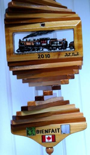 Share via Share via... Twitter Facebook Pinterest × Table of Contents My Woodworking Projects Toys Misc Pictures of my Whirlys, I have made for Friends and family Games My Woodworking Projects Besides Genealogy, and History Web Sites, my other Hobby is Woodworking. Now, after many years, I have a nice Workshop, and a nice selection of basic wood tools, that I can do major damage with. I have added some photos below of some of the creations I have made. Toys Wood Toys for my Grandchildren, Nathan, Liam and Katelyn- Dec 2014 Giraffe Puzzle in book form for Grandchildren. Dec 2014 Unique Crib Board from a Hazelnut branch, for my Grandson, Dec 2014 Noah's Ark Toy for my Grandson Liam complete with around 30 pairs of animals inside I called it the “Acrobat Man”, an old toy, My dad made me one of these when I was a boy So I made 3 of them, 2 as gifts, one for myself. Squeeze the short part of the handles, and the wooden man does spins in the top portion. I now have found plans for a acrobat clown, which one day I will make. Wood Box made to hold the toys below Helicopter Logging Toy Set, for my grandson Braiden, Dec 2005 Lots of hours went into this set, and almost kept it myself to play with. Home School Desk for my Grandson 2008 made to fit on top of a wooden TV table Misc Tardis anyone? made for my son Terry Used a magnet to suspend this one, so it spins, it also had a door, when opened a light inside comes on. “Love Spoon” for a wedding gift for my son Terry, and his wife Jillian Made from a piece of Honduras Mahogany, various items carved in the spoon, that they both like. My first attempt at this art style. Turns out Jillian's parents bought a love spoon, with the Ukrainian Triad, and Elk, carved by a master carver, down in southern BC. It was carved in yellow cedar. (picture above shows a table runner quilted by my wife.) I also made a wooden box from aromatic cedar, with box (finger) joints, to hold the spoon. Made a 12 x 14 x 6 in. high Red Cedar Memory box, with box joints for my niece Cindy Gent. no pics yet. Grain Elevator Bird Feeder made for my niece in Vancouver, these are her pictures. Fairy Theme tray for my wife, 2008 made from recycled panelling plywood with black walnut splines on the corners Something different- Wooden Flower Vase This was a flower vase I made in Dec 2009, from a piece of natural diamond willow The tulips and bull rush flowers, and assorted length leaves, I made from scratch. This was made as a gift I used just about every tool in the shop to make this project. The base was recycled from an old solid mahogany plant stand. The tulips from old 2×4 stock, from a recycled glass window shipping crate, and the bull rush heads from an old broken broom handle, the only bought item was the wooden dowels (flower stems). All the flowers and leaves I painted with acrylic paints, then all was varathaned, so they could be dusted easier. These flowers never die, and no watering required, and for those with allergies, no need to worry either! King Tut bird feeder for my Aunt Dolly lid lifts off and hooks on top rail, to make 2 handed filling possible Everything but the rope was recycled materials My wife and kids wanted a cage for hedgehog pets, so this was the result. Learned how to cut plate glass for this one. Around this same time I made a rectangle glass box, twice as big as this one, with 2 levels, and 2 sliding doors on the front, for 2 Chincillas the kids had. (no Photo yet) Walkway over our little pond. We are still using this walkway years later. Menorah Wood Candle Puzzle I made as a gift ECI Reunion 2017 Wood Sign I made for ECI Reunion 2017 Silent Auction Made out of aeromatic cedar. Bought by my Hillside School Friend, Bonnie Frank, nee Thompson Pictures of my Whirlys, I have made for Friends and family These whirlys take very little wind to spin, and provide hours of enjoyment watching them. I use a fairly long nylon string to hang them, using no spinning joints, which enables them to spin in one direction with very little wind, then they unwind the string, and spin back with no wind. If you shorten the string, or use fishing spinners, you loose this reversing effect. Some have shortened the strings which is their choice. Tools I use, are a dremel tool for the carving and fine sanding, and a scroll saw for the outline shape of the center piece, and top and bottom pieces. My old 9“rockwell Table Saw, and my dad's old Delta Radial Arm Saw, makes all the slats, and a portable belt sander finishes them off. Delta Drill Press makes all the holes for the dowels. I have a Delta mini lathe I use for top and bottom finials on some. I love the carving and painting part, and hate making the slats. They are just too boring to me to make, and even more of a pain to sand. PM Woodboss Chainsaw, Whirly made for my carver friend JJ and wife Angie. He made me the welcome carving on my home page, so I had to make something for him. Whirly, made for my brother Don, 2011, carved from red cedar, with cedar strips, and painted with acrylic paints. Eastern Collieries Shovel and Truck “Mining 42 Coal” ca 1945 This scene I carved is important to our Gent family, as my Dad worked underground at the Eastern Mine, his brother, Jim Gent was Superintendent there, and his brother in law, Herman Widdifield, was a mechanic, who worked on this 75B shovel. Whirly made in April 2010, for my brother Wayne as a special birthday gift M&S Train Whirly This is my version of the M&S coal train located at Bienfait Sask. Roller Derby Whirly for daughter-in-law Wheels turned on this one Moose Whirly- This was a whirly I made for friends, Dean and Sue Bergstrom in Terrace, in the summer of 2009, Since Dean is a moose hunter, and has given us bones for our dogs, and samples of the meat which is great, I decided to carve a moose in the center for them. The center is carved from one piece of cedar, which is the same on all my whirlys. I never carve the same image twice. Not yet anyway! I us