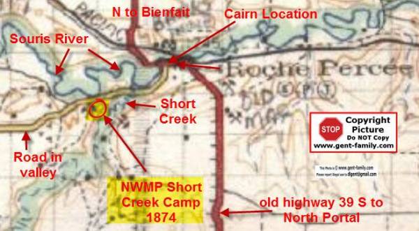Share via Share via... Twitter Facebook Pinterest × Roche Percee Camp Roche Percee, Saskatchewan, Canada The NWMP (NORTH WEST MOUNTED POLICE) forerunner of the RCMP (ROYAL CANADIAN MOUNTED POLICE) stopped at Roche Percee in 1874 and this is an actual account below from the diary of Henri Julien, who accompanied the group. July 25, 1874 We reached Roche Percée. This singular rock is a white sandstone of wind formation, running up like a crest from the bottom of the Souris Valley. At its base. it measures about 35 feet in height and the base about 140 feet. Some parts are softer than others, and from the combined influence of wind and rain, fissures and holes have been worn through it. On different parts of the rock are cut the names of people who have passed by and many hieroglyphics which, of course, remain a mystery to us. -Henri Julien Henri Julien- Bio Ext link below Sketch by Henri Julien in 1874 On Wednesday, May 26, 1999, at 1600 hrs, this March was re-enacted into the Village. CLOSE-UP OF THE PLAQUE SHORT CREEK NWMP CAMP NWMP Cairn supposed to mark the spot where the NWMP camped on July 25, 1874, on their way to Fort McLeod, AB This was NOT the Exact location of the Short Creek Camp. Now have heard from 2 sources, the location of the camp was actually on a piece of land owned by the Langen family today (2011) and used as a hay field. The Real location was the West side of Short Creek (Riviere Courte) south of the Souris River and SW of Roche Percee. All based on an original sketch of the camp, from 1874, compared to views today. part of my Dad's 1927 map of this area Camp location SW Section 25 , Township 1, Range 7, W2 lat- 49- 03- 50 N long- 102- 49- 10 W Elev 535 ft It is a bit of a mystery why the Cairn is in downtown Roche Percee, but probably a way for tourists to take pictures of the general area it was in, without disturbing the Langen family. Please note- I would ask anyone going there, respect their wishes, and stay off their land, Without asking their permission first. NWMP had a Barracks down near the USA border, NE Section 1, Township 1, Range 7, W2 Map showing NWMP Short Creek Barracks Part of my Dad's 1927 map Map showing the Barrack's Location at bottom of map above, from 1955 History Book This map also shows the location of the Red River Cart, at the intersection of the Boundary Commission Trail, and the old original location of Highway 39 from Roche Percee to North Portal. See my Estevan NWMP Wood End Museum Page For more Pictures from this event Ext Links https://www.thecanadianencyclopedia.ca/en/article/octave-henri-julien/ © Last modified: 2018/01/25 15:54by dlgent Log In