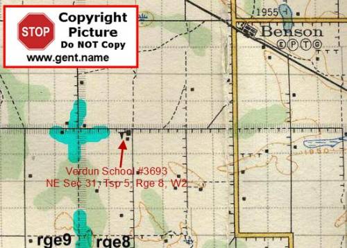 Share via Share via... Twitter Facebook Pinterest × Verdun School #3693 Benson, Saskatchewan, Canada Part of my Dad's 1927 Map Located on NE Sec 31, Tsp 5, Rge 8, W2 2 miles South, 2 Miles West, of Benson SK 1935- L. Beaudry was Sec-Treasurer, address Box 61, Benson SK 1946- 24 pupils, board 1/2 mile from Benson 1948- 20 pupils, board for teacher was 3/4 miles away at $30 © Last modified: 2020/01/22 16:07by dlgent Log In