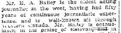 Share via Share via... Twitter Facebook Pinterest × Newspaper Editors Estevan, Saskatchewan, Canada James Weidman I have always read, The Estevan Mercury was the First Newspaper in Estevan, started by a Mr. Bailey, until I found this article, dated Oct 22, 1892, which states, a newspaper was to be started up in Estevan by a Mr. James Weidman, who was Editor and Proprietor, of the Rat Portage “Record” newspaper. Today this is Kenora ON. I have not seen this anywhere, so not sure what he even named it. note his name is spelled wrong in this article. In 1880 he was Editor and Publisher of the “Progress” newspaper, in Rat Portage, Kewatin It was published on Fridays, 4 pages, 21 x 27 size, Subscription $2.50, established in 1880 1893-94 he was Sec-Treasurer of the Western Canadian Press Association, listed under Ontario heading 1881 shown as a widower, no children with him, occupation Publisher, at Eastern Extension, Extension, Manitoba. 1891 in Qu'Appelle District, Assa. with wife and children 4th daughter might be Hilda O. M. Weidman, b- 1876 in ON other 3 shown below 1901 living in Rat Portage wife- Eliza J. , and 3 of his 4 children: Son- Victor Nugent Weidman, b- July 7, 1880, in ON Daughter- Lila Klotel Weidman b- Dec 30, ca 1883, in ON Son- Roy Walter Weidman, b- Mar 14, 1887 in Assa. JAMES WEIDMAN, bio Quoted from a book printed in 1894 Editor and Proprietor of the “Record”, Rat Portage, Ont., b- Sept 12, 1850, In the township of Pickering, Ontario County, ON He received his education in the public schools, and he is practically a self- made man. He subsequently served an apprenticeship to the printing trade, on the “York Herald”, at Richmond Hill, ON. Wwhere he originated the process of printing several colors at one impression, on a hand press. He remained on this paper six years, and afterwards worked at different places, and in 1870, with another printer named Hart, established a Conservative newspaper, The “Brampton Progress”, which lasted 2 years. In 1873 it became “The Conservator”. In 1878, he started the “Selkirk Inter-Ocean” at Selkirk, Man., this being the first paper in the North-West, outside of Winnipeg. In 1880, One article says August 1881, this plant was removed to Rat Portage, and the “Progress”, now “The News”, was established. After sixteen months, he accepted the office of Registrar of Deeds for Manitoba, but when the territory was given over to Ontario, he lost the office. In Nov, 1885, he started the “Qu'Appelle Progress” at Qu'Appelle, Assa., known as the “Progress”, advertised as a strong Prohibition newspaper. In 1891, sold the same to Mr. A. C. Paterson, and returned to Rat Portage, in July, 1891, and established “The Record”, which is fast pushing to the front. Mr. Weidman is one of the ablest and most pushing newspaper men in the Dominion of Canada, and possesses that keen insight and enterprise which are so helpful in opening up the resources of a new country, and judging from his past successes, it is quite safe to predict for him a brilliant future. In politics, he is an Independent-Conservative, and in religion, a Methodist, and is Superintendent of the Sabbath School, in his town. He is also a strong prohibitionist, and a past D.D.G.M., in the Masonic Order. Mr. Weidman has been married twice: first, in 1873, to Hattie Oriel Adair, daughter of John Adair, of Toronto, ON., by whom he has one son and one daughter, and second, in 1881, (after census) to Eliza Jane Bamforth, b- Nov 12, 1862 daughter of Charles Bamforth, of Manitou, Manitoba, by whom he also has one son and one daughter. I haven't been able to find when and where he died. Edward Alfred “Gink” Bailey Found a Edward Bailey family in 1881, living in Woodstock, Oxford North, ON wife- Eliza Bailey, b- ca 1838, in England, age 43, Edward, shown age 44, as a painter. Church of England. 1886- S. A. Bedford and E. A. Bailey, Winnipeg - donated these items to the Manitoba Museum - Cavalry Carbine, Pistol and Sword, Relics of the Windmill Fight, Prescott, Ont., 1838. Oct 22, 1892 Mr. Bailey is opening up a business, with Mr. P.C. Duncan No mention of a paper yet. Same Bailey? Nov 17, 1892 Mr. Bailey and family arrive from Brandon 1901 the Bailey family were at RM of North Norfolk, Tsp 11, Rge 10, Macdonald District in Manitoba Edward Alfred Bailey b- Nov 9, 1838, in England Widow now- Editor of a paper Son- John W. Bailey b- June 10, 1870 in ON Occupation- Reporter Son- Charles Henry Bailey b- Nov 13, 1877 in ON Occupation- Printer Son- Samuel J. Bailey b- Dec 28, 1891 in Winnipeg MB Son- James Diell Bailey b- Oct 12, 1893 in Winnipeg, MB Daughter- Ruth M. Bailey b- Jan 28, 1897 in Winnipeg, MB June 30, 1903 First Issue just days before this. July 27, 1903, Here we now see, Mr. Edward Alfred Bailey and his son Mr. Charles Henry Bailey are running the Estevan Mercury under the name, Bailey and Son. Other notes say Bailey and Sons. July 27, 1903, Mr. Bailey has high credentials. Oldest acting journalist in the west, with over 50 years experience. John W. Bailey and Charles Henry Bailey July 26, 1905 John W. Bailey listed as Editor of the Estevan Mercury At that time he had spent 23 years in the west, and resident of Estevan for 3 years. He was a brother of Charles Henry Bailey, both shown born in Ontario in 1906, living in Yellowgrass SK, on Railway Ave. Charles 28, John age 36 Edward A. Bailey owned the Morden Herald, Morden MB in 1911 census James and Ruth were at their Grandmother, Maria Finn's place at 86 Disraeli St., in Winnipeg, where James was in 1918 above with them more Baileys, Cousins I guess to Edward Bailey's children, All 5 at their Grandma's place, John Bailey- b- Dec 1892 Edna Bailey- b- July 1895 Maria Bailey- b- Mar 1899 all shown born in MB. all Baptists. So obviously Edward had a brother too Maria Finn, grandmother- b- Feb 1852 in USA owned a Boarding House. His son Charles Henry Bailey took out a western land grant on NE Sectio