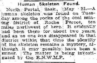 Share via Share via... Twitter Facebook Pinterest × Roche Percee History Articles Roche Percee, Saskatchewan Below is a list of articles I have found, concerning the Roche Percee area, this includes Old and New Taylorton, Coalfields, Roche Percee, etc. Page 1- 1891-1899 Page 2- 1900-1919 Dec 5, 1891 Sheriff's sale for Egan Bros. Coalfields, Patrick, Martin, and Anthony Egan sale at Carnduff. George B. Murphy, Sheriff, Judicial District East Assiniboia. Sheriff's office- Moosomin George B. Murphy b- Mar 1, 1858, in Portage Du Font, Quebec d- Nov 22, 1922, buried in Moosomin Cemetery Irish Nationality, Methodist George Murphy's wife- Ada May Murphy, nee McRae b- June 22, 1864 d- May 20, 1917, buried in Moosomin Cemetery Scotch Nationality, Methodist her mother Jane Ann McRae was living with them in 1911 3 Children I know of born in SK Editha (Edythe) Jane Campbell Murphy, b- Dec 8, 1889 d- Nov 22, 1950, buried in Moosomin Cemetery Gerald George Murphy, b- Dec 9, 1892 d- ? Marguerite Jessie Murphy, b- Aug 17, 1897 d- Mar 24, 1924, buried in Moosomin Cemetery a possible relation: John Donald Murphy, d- June 23, 1991, buried in Moosomin Cemetery George was appointed Sheriff in 1889, He was a member of the Masons, holding the title of Grand Master. In the Rebellion of 1885, he was appointed Transport Officer, of the Battleford Column, 2nd Division, of the North West Field Force, Colonel George B. Murphy. Before this he was a Surveyor. He wrote a diary of the day, which is in the University of SK archives. He was in partnership in a harness business in Qu'Appelle Egan Brothers Patrick Egan - b- Sept 18, 1854 in ON wife Margaret, 3 sons and a daughter living in Winnipeg, in 1901 Martin M. Egan b- Oct 23, 1857 in ON wife Catharine, one son William M. Egan, living in Winnipeg, in 1901 Anthony Egan b- 1867 in USA Father- Anthony Egan- b- 1830 in Ireland Mother- Bridget (Brydges?) Egan, b- 1828 in Ireland brothers: Edward Charles Egan, John M. Egan, Michael Egan, and Peter Egan one sister, Mary Egan 1881 all living in Winnipeg, Selkirk, Manitoba, all Roman Catholics Father shown as a contractor as well. Edward Charles Egan b-1852- d-1924 born at Fullerton New York. Edward and John came to Winnipeg first, and Edward was also involved in building railroad lines, including the Crows Nest Pass Line. It appears this family was involved in the CPR Railroad from day one. Feb 12, 1891 George Anderson writes to his MP Dewdney, asking for a railroad to the Souris Coalfields. They were in Winlaw Assiniboia at the time. Meeting at the home of Mr. Sadler. Location of Winlaw, Sec 22, Tsp 1, Rge 30, W1, South of Gainsborough, no longer exists. May 21, 1892 Railroad is being constructed, 5 gangs at work, Egan's, McAnnarry's and McKenzie's outfits. Egan's are back in business it seems? Feb 15, 1896 3 parts below, some overlap, sorry Here we see the new CPR passenger and freight depot is built. A Mr. Bigg is a pit boss at the mine. Mr. Fred Gaw, son of the Justice of the Peace is mentioned. He was drilling an air shaft for his mine, and discovered high grade asbestos. I believe the name is Gow here, but I can't find a Fred Gow in 1901 census? There also was a miner's boarding house. Then the big news, an active volcano in the area 1896. 10 years earlier, 1886, it was actively erupting. Now I have Never heard of a volcano in this area, ever! July 23, 1896 Interest in Lignite Coal is building May 7, 1897 Names mentioned in article below: Mr. James Mills Mrs. George Gow, both ill Rev. Mr. Scott preaches on Sundays Rev. Mr. Jamieson, Presbyterian, Sermons on every 2nd Saturday. Both Ministers are from Estevan. Union Sabbath School opened. Officers elected: Superintendent, Mr. T. H. Truscott (see below) William Hamilton, Sec-Treas., Bible class teacher, G. E. Garbutt, Children's teacher, Mr. Truscott, (see below) G. E. Wiegand family leaves to Burlington ND Souris Coal Mine developing a new shaft on other side of cut from their existing mine. Mr. Thomas Henry Truscott was in Alameda Jan 1, 1905 when his wife Florence Alberta Truscott, had a son John Henry Lloyd Truscott Dec 1921 he was a member of the Alameda Council but in 1901 census in Alameda, he is shown with wife named Margaret Truscott. He is shown b- May 7, 1867, in ON, Methodist, Farmer. she is b- Oct 14, 1875 in ON May 25, 1897 Mr. F. D. Freemantle looking after Roche Percee Coal Mining Companies property, left for England. This should read Mr. H. D. Freemantle, short for Henry Douglas Freemantle, see his history on the next Roche Percee history page. T. H. Truscott, and G. E. Garbutt played with the Estevan team, against Oxbow. Average School attendance is 12 Rev. Mr. Pratt, Church of England minister from Estevan holding services at the home of Mr. George Gow, every Sunday Lots of wild fruit in the valley. June 14, 1897 Souris Coal Mine operation described. Portal, Dunbar's, Coalfields, and surrounding districts, will celebrate Queen's Jubilee. John Heas visited from Fargo ND. Mr. John Truscott and Joseph Morrow of Alameda were visiting. Mr. Patterson Custom House Officer at North Portal, came to town. June 15, 1897 Roche Percee Coal Company closed, and being liquidated. Mr. Gosher has made an offer to buy all the assets. Liquidator, Mr. Bertrand. Oct 4, 1898 Big storm reported. Manager Cockburn and his wife returned from Winnipeg. Preparations for a second railroad track are being made. Houses being remodelled and enlarged. Mr. Terry, an ordained Anglican clergyman preaches every Sunday, in one of the old buildings belonging to the old Dominion Coal Company. Mr. Brokenshire, the Presbyterian minister, preached his last sermon after a winter there. Click here to view Page 2, 1900-1914 Articles from 1900 to 1914 inclusive Mar 8, 1900 Austrian miner, from the Roche Percee Colliery Company, disappeared walking to Estevan, carrying lots of cash. Literary Society beat Estevan. Mr. Stokes and Mr. Peverelle Jr. in upcoming play. Mr. J. Cockburn is away on business. 